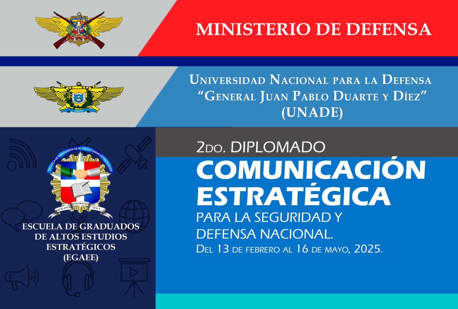 La Escuela de Graduados de Altos Estudios Estratégicos (EGAEE) de la Universidad Nacional para la Defensa “General Juan Pablo Duarte y Díez” (UNADE) del Ministerio de Defensa, abre la oportunidad a interesados en cursar el Segundo Diplomado de Comunicación Estratégica para la Seguridad y Defensa Nacional, cuyo objetivo es dotar a civiles y militares, de conocimientos, competencias y habilidades, en esta área del conocimiento.
