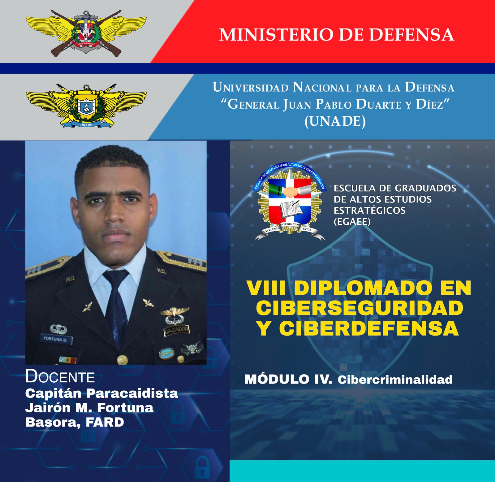 El docente responsable de impartir este módulo fue Capitán Paracaidista Jairón Manuel Fortuna Basora, FARD., hay que destacar que el maestro es Licenciado en Ciencias Aeronáuticas. Tiene un Diplomado en Operaciones Fronterizas Terrestres, así como, varios cursos: Pasantía Internacional de Defensa para Oficiales de Naciones Amigas del Foro Iberoamericano de Ciberdefensa (CIGE, Brasil); Comando de Escuadrón y Auxiliar de Estado Mayor, (EGCEMA); Desarrollo de Políticas Cibernéticas y Aplicaciones de la Inteligencia Artificial para la Defensa, (Washington D.C.), y por último, Militar Internacional de Informática y Ciberdefensa para oficiales, (Guatemala). Actualmente, es Subdirector de Ciberseguridad y Ciberdefensa del Centro de Comando, Control, Comunicaciones, Ciberseguridad e Inteligencia (C5i).